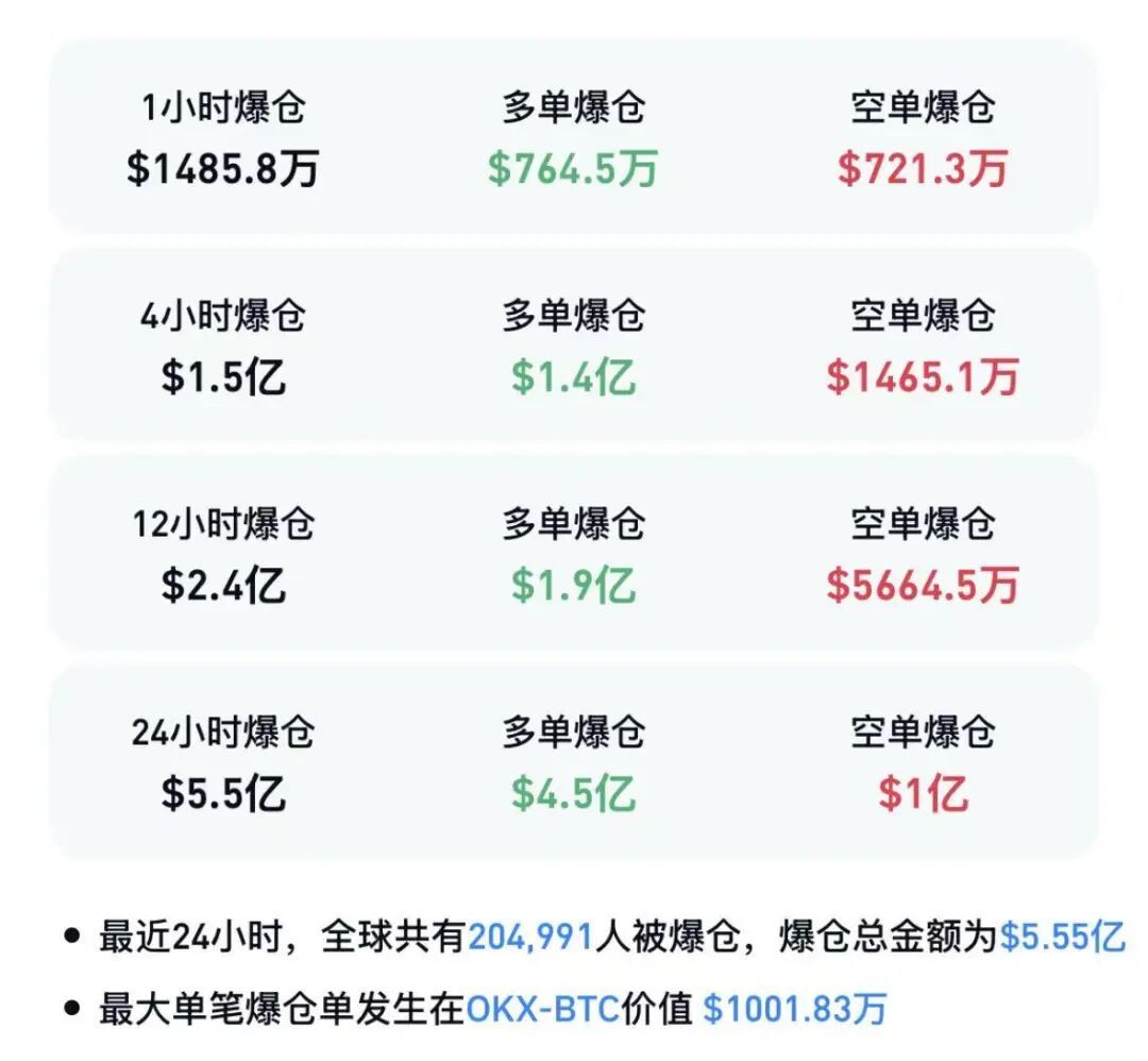 CoinGlass数据显示,最近24小时,全球有超20万人被爆仓 ,爆仓总金额为5.55亿美元。