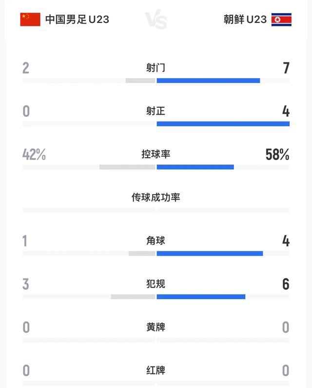 从数据上来看,中国队半场全面落后,中国队射门只有2次,没有射正,朝鲜队7次射门4次射正,对方控球率达到了58%,我们只有42%,对方4个角球,中国队只有1个角球.
